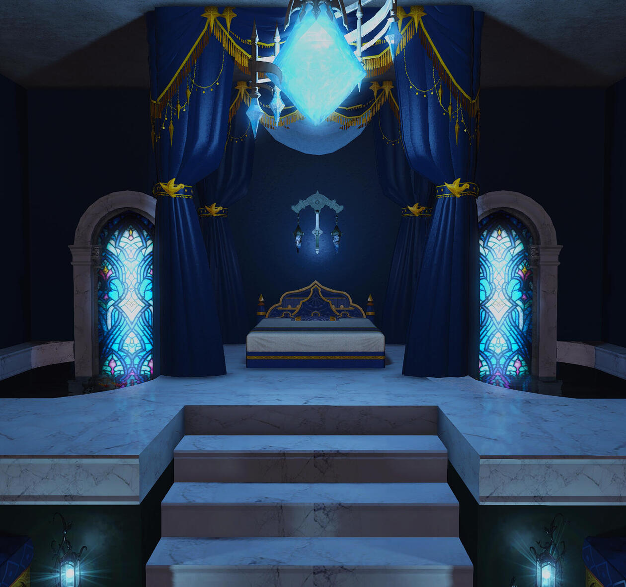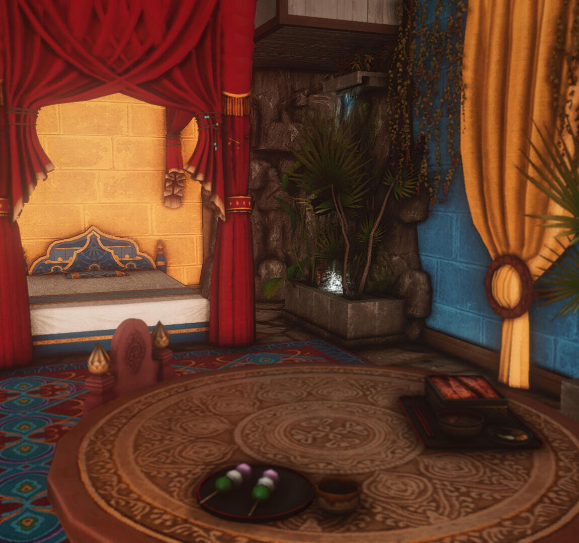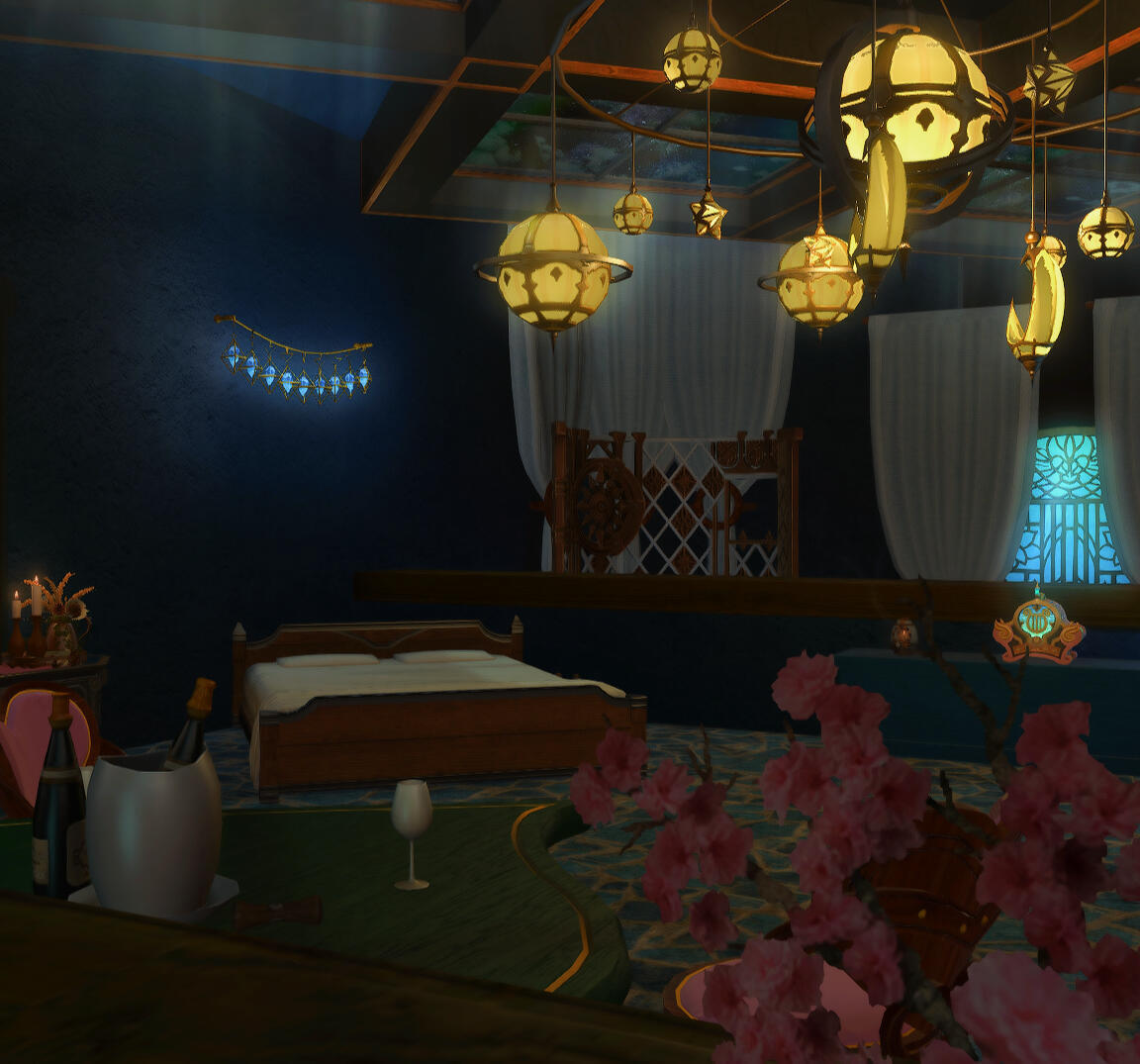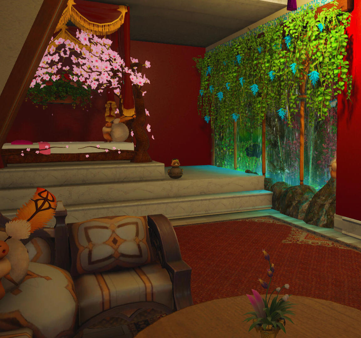a room that houses a shrine fit for a primal- and maybe it is for a primal- or a bratty pink miqo'te. either way, it's a room that would be an honor to spend a night in with all the gold, flora, and the silken pink curtains everywhere. Hope you like the smell of cherry-vanilla incense!