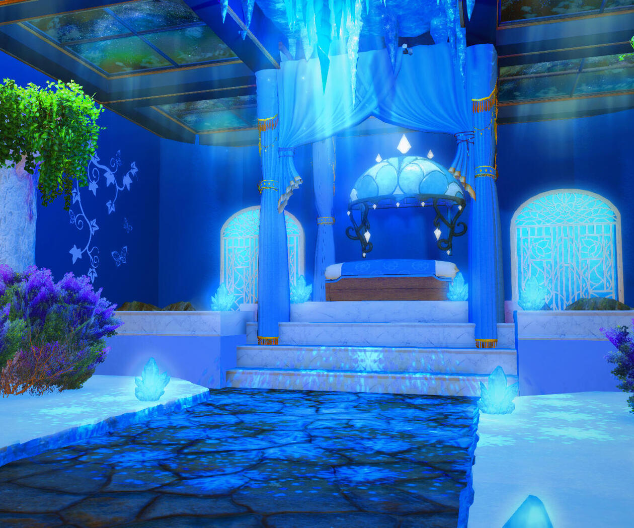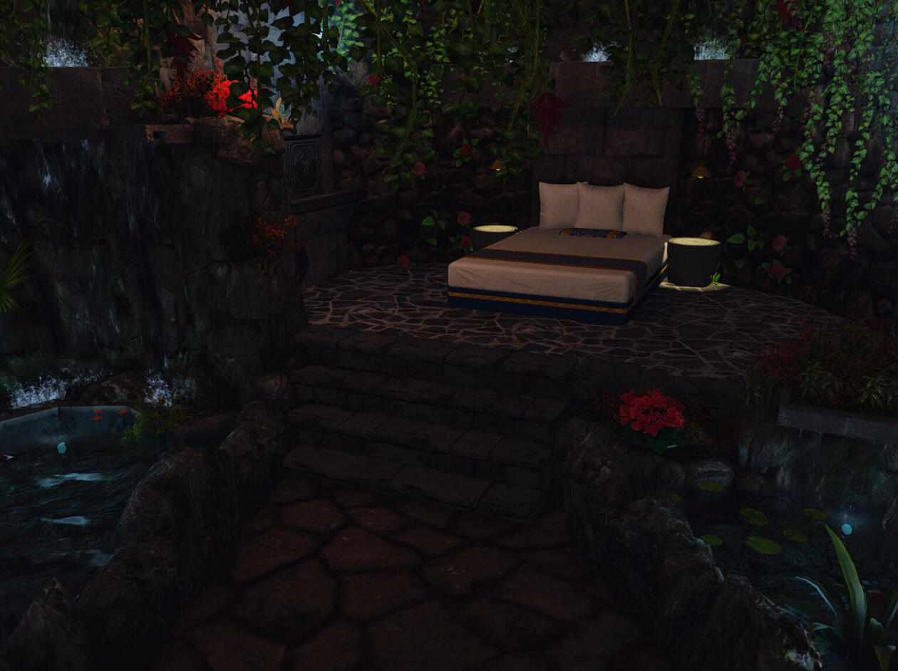 Another beautiful room housed within our garden at MMO! This one has actual walls made of wood, though. A cute little room to spend a quiet (or not-so-quiet) night in. Fit with a fluffy bed surrounded by flowers, a curtain of vines to make the lighting serene and comfortable, books for you bookworms, and a bath and vanity for easy cleanup and intimate bathing.